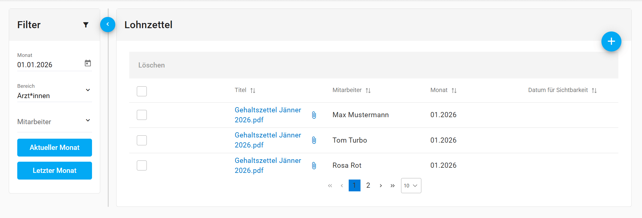 Mit dem Feature „Lohnzettel Multi Upload“ übermitteln Sie Lohnzettel zentral und sicher direkt an Ihre Mitarbeiter – ohne extra Tool und ohne Versand per E-Mail. Jeder Mitarbeiter erhält automatisch seinen eigenen Lohnzettel, der ausschließlich für ihn sichtbar ist. Das reduziert manuellen Aufwand, eliminiert Verteilfehler und schafft eine klare, nachvollziehbare Bereitstellung im System.